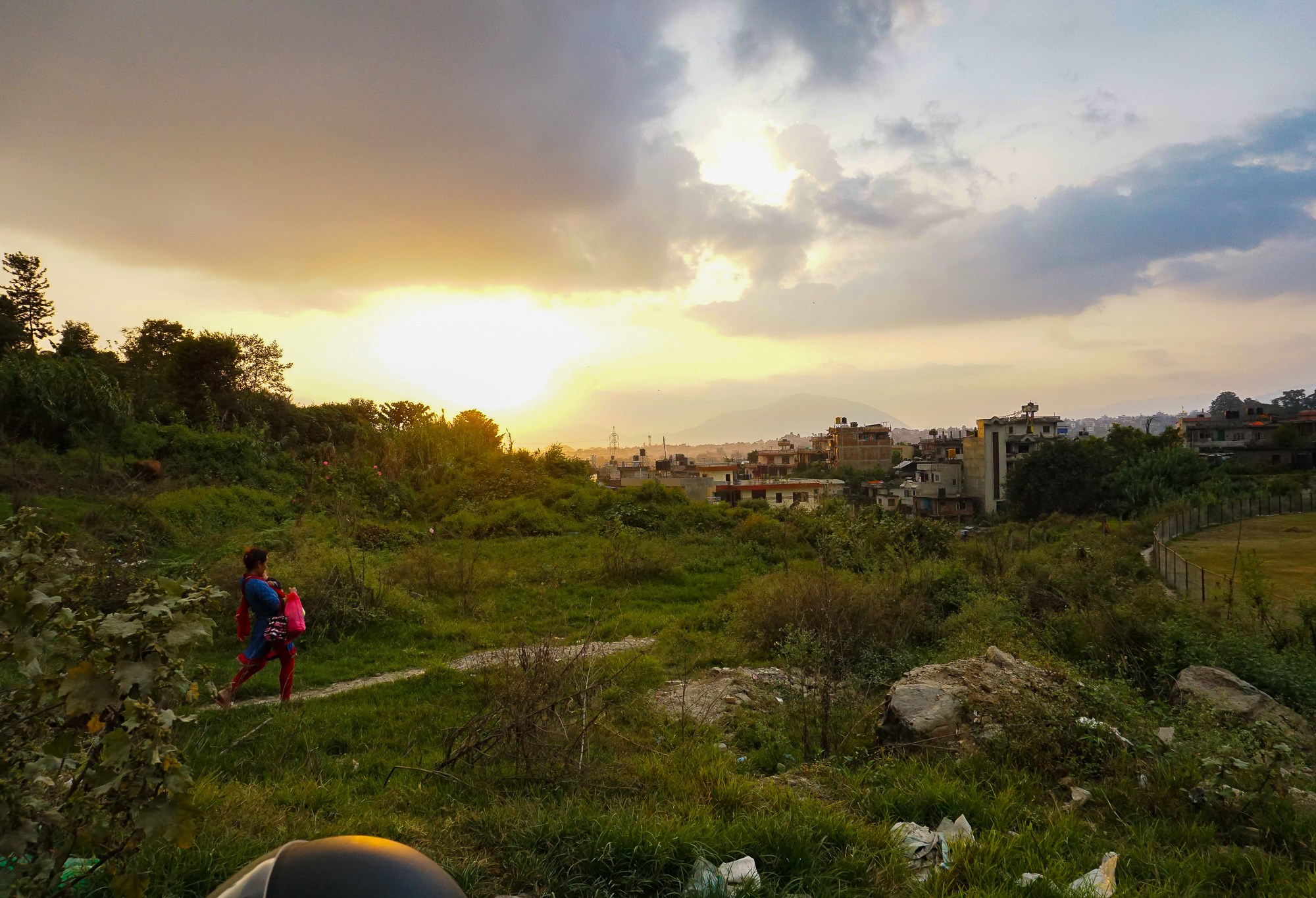 The buildings were getting smaller and further between; the gaps between were windows to rolling hills and the beginnings of the mountains. Eventually, I came to a fork in the road — One path just snaked away into farmland, and the other went up the hill I was adjacent to. For the first time, I stopped to look behind me and saw the sun setting over the entirety of Kathmandu.