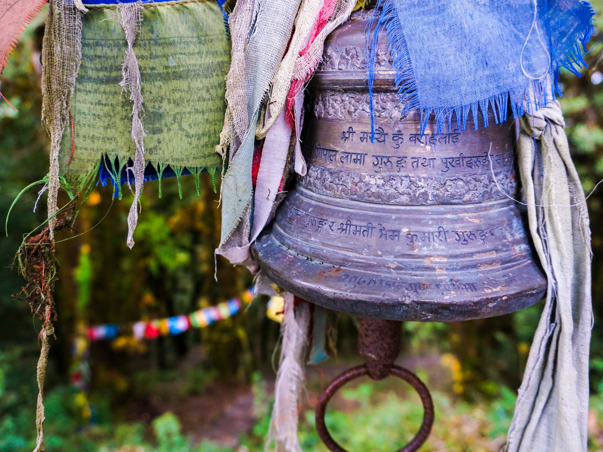 At the top was a small temple wreathed in a web of prayer flags in the typical Himalayan fashion. Bells hung from the trees around the structure and the wind carried their lonely chimes away into the fog. The ledge overlooked the entire valley. I sat for a long time, wondering about the purpose of this shrine and falling ever further behind my trekking partners. It was a serene place, and a welcome change from the miles and miles of forest.