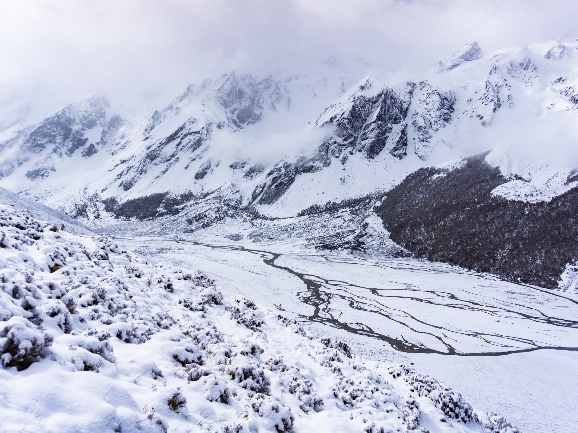 I stopped periodically to take in the view from the mountainside, and began to notice dark clouds moving up the valley. The snow on the mountain had stopped, but the clouds were closing in on us quickly. We tried to quicken our pace, but in knee-deep snow at 4,500m, any pace feels like a fast one. It wasn’t long before I was wondering if I was going to be able to make it up. We paused for some rest, and I put my coat back on to cover my sweat-soaked underlayers. I took just a few more photos before we convened a meeting about the fate of this ascent.