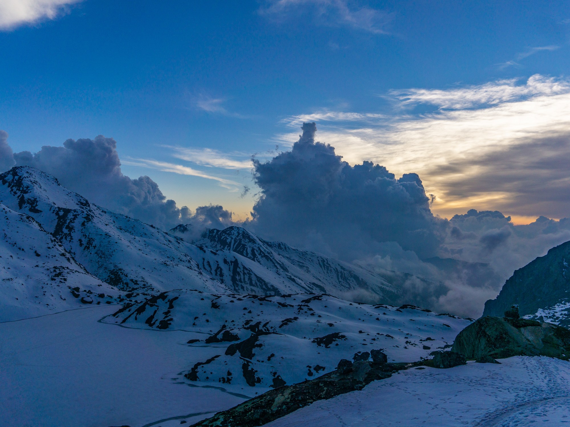 We sat awhile, warming our fingers with metal cups of tea and passing the time. We walked along the lakeshore and Pemba visited the temple outside the village. I listened to music and drank tea. But as the sun started to set, the sky came alive. Blue hour’s mellow, cool tones were broken by a streak of orange cutting across the sky, the clouds of the valley breaking on the rocks below us like waves. Large crows circled overhead and the wind blew.