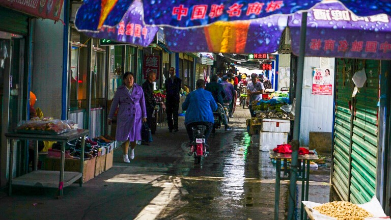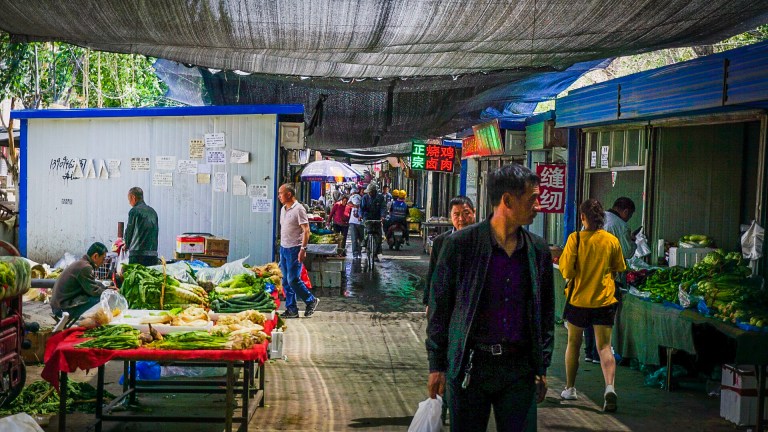 Still, in spite of the apparent lack of culture (and life in general), not all was empty. As I walked, I saw turquoise minarets of a mosque in the distance. Directly across the street was a narrow alley, squeezed tightly with a street market. Just one street. But it seemed that all activity in Jiayuguan is confined to that place.