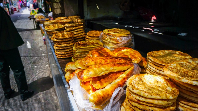 The scents of spices and herbs and fresh fruits waft around, intermixing with the shouts of vendors. Butcher shops offer up slabs of meat a foot across, laid beside whole sheep heads. Bakers stack fragrant flatbreads on counters outside their kitchens. One such baker saw me slow down and snatched a piece of bread off the stove, tossed it through the window and across the gap behind the counter to land with a thud in front of me. It must have been several meters to throw it that far, but he really wanted me to try his bread, apparently. It was good, too — seasoned with honey and peanuts. He was stoked to have a foreigner at his stand. I sense foreigners don’t typically take the time to search out these corners in Jiayuguan.