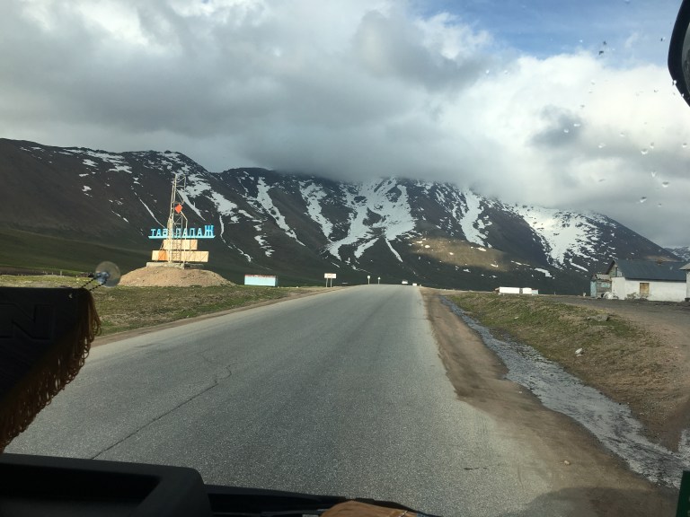 The drive was only an hour and a half — Kyrgyzstan is pretty small. For much of it, the road hugged the Uzbek border so closely that we were sure it was just over the first hill. Traditional Kyrgyz vocals laid over EDM beats strained the speakers, but the driver kept the music up high the whole way. He dropped us on the side of the road outside Jalalabad, not quite in the city, which was good — it’s much easier to find rides on country roads than in cities. We had fried noodles and tea at a roadside restaurant across the street, then wrote a new sign: “Таш-Кумыр” (Tash-Komur).
