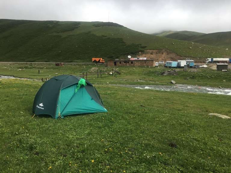 Manas wasn’t much farther, and when we arrived, we jumped out and shook their hands. The town was only a few hotels and restaurants; a truck stop. And it was cold. We went into a restaurant where the girl asked if we spoke German. We didn’t, and English got us through. I had some potato soup and then we left to set up our tent across the river once again.