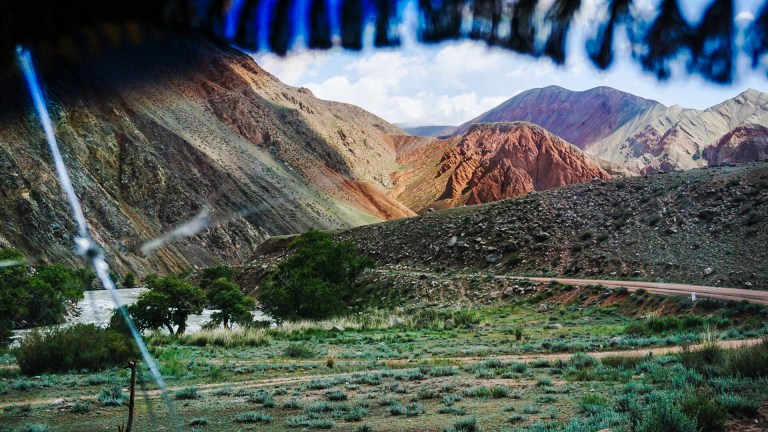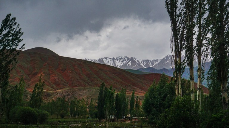 We continued on through the valley, our driver weaving through massive holes in the road as his two trailers, one full of honey and the other with a horse, bounced along behind. In front of us, the valley wound its way through the Martian landscape until the snow capped Tien Shan Mountains became visible at the end.