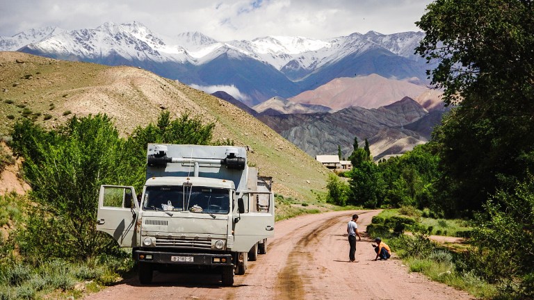 But no sooner did we get out than a rickety old truck pulled up and gave us a lift. It was a man and his 11-year-old daughter, as we learned, bound for Suusamyr, the main town in the valley. She gave us some vegetables to eat as the truck bumped its way down the road.