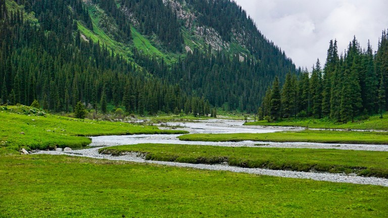 The first half of the Ala-Kul trail is just a dirt road. Sometimes cars drive up it, but not very often. Mostly it’s guys on horseback moving their flocks around. For a couple hours, the trail moved through a narrow valley. There was a large river on one side and snowy peaks further down, but the trail itself just steadily rose in elevation with a cold wind blowing down off the mountains. Much of it was quite muddy or just underwater, which wasn’t as much of a problem since I was wearing sandals. But a couple wades through frigid mountain water was enough for me.