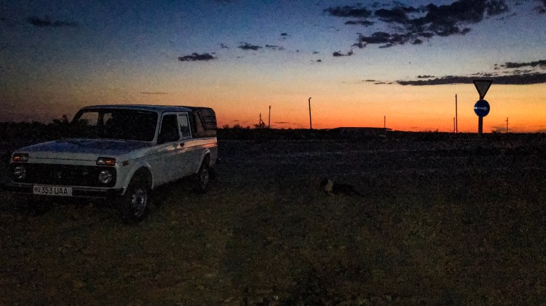 The moment we got out of the Bukhara city limits, the driver took off, setting a breakneck pace through the vast desert. Any slow-moving truck was merely an obstacle around which to swerve and continue. Sometimes a faster car would pass with a honk, and other times a lone cyclist on their way across Asia would wave from their camp. We continued on into the sunset, watching the sun streak the sky over the vast shrub-studded sand. For hundreds of kilometers, nothing changed. Once the sun was mostly down, we stopped at a roadside restaurant along with most of the truckers.