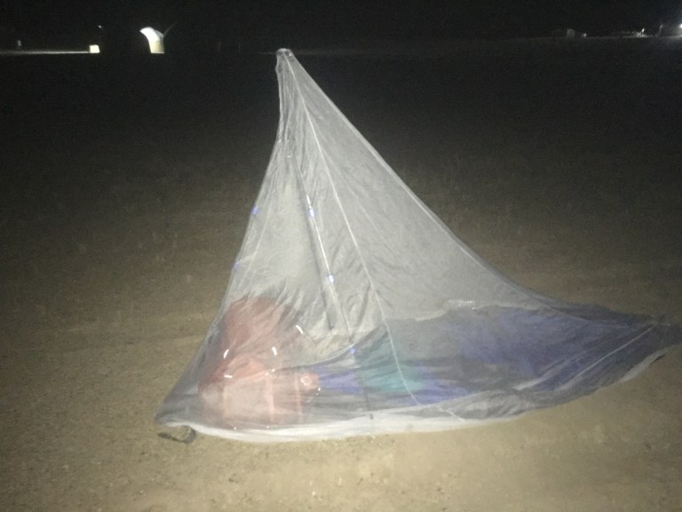 The spider hit the sand with an audible thud and then scuttled off into the grass, kicking up sand onto my shoes as it made its getaway. I stood a moment, arms crossed, the vibe of cowboy camping sufficiently killed. Slowly, I returned to my campsite in the grass and immediately set to work adding a bug net, propped up with my camera tripod.