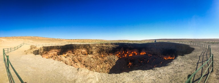 Way back in the Soviet days when Turkmenistan was still the Turkmen SSR, scientists were here looking for oil and natural gas. While drilling on a fateful day in 1971, they found an underground cavern, which collapsed and took the drilling rig with it. In fact, there’s still metal springs and beams protruding from various spots in the crater. After the collapse, noxious methane gas began spewing into the atmosphere. In a disaster-mitigating move of typical Soviet style, scientists went, LOL, let’s set it on fire and let the gas burn away.
