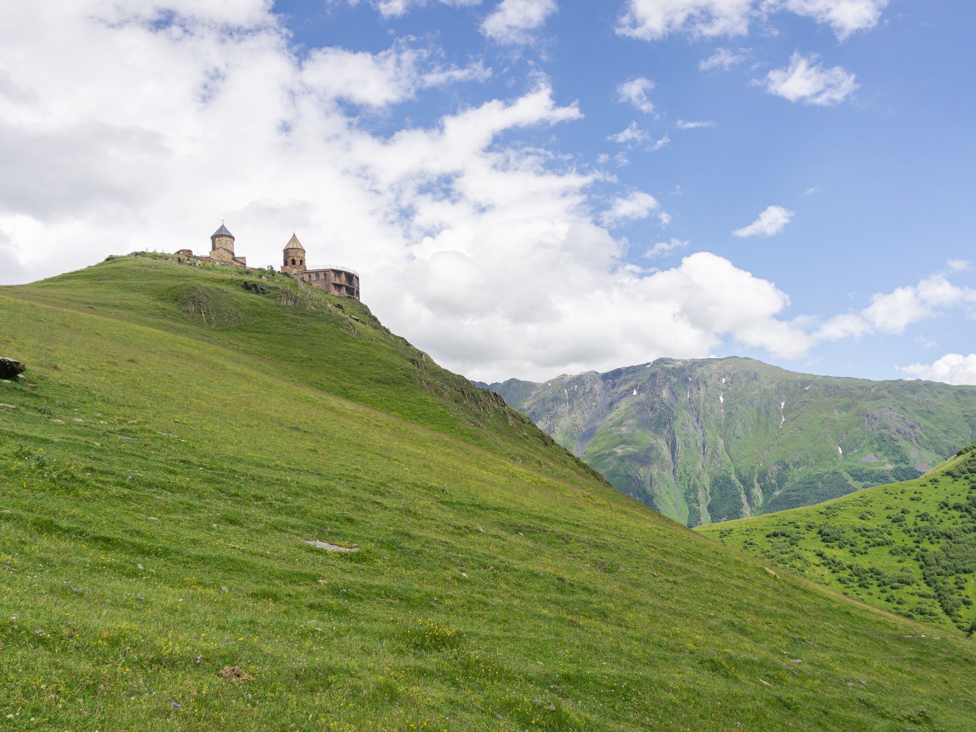 We struggled our way higher up the mountain. Gergeti Trinity, which had been looming over us, was now obscured by the jagged ridges and rolling alpine meadows. The church sits well above the tree line, with bright green grass running flowing in the wind all across its ridge.