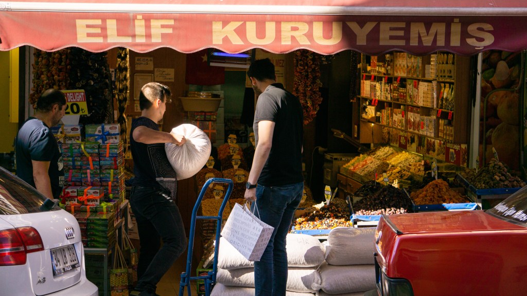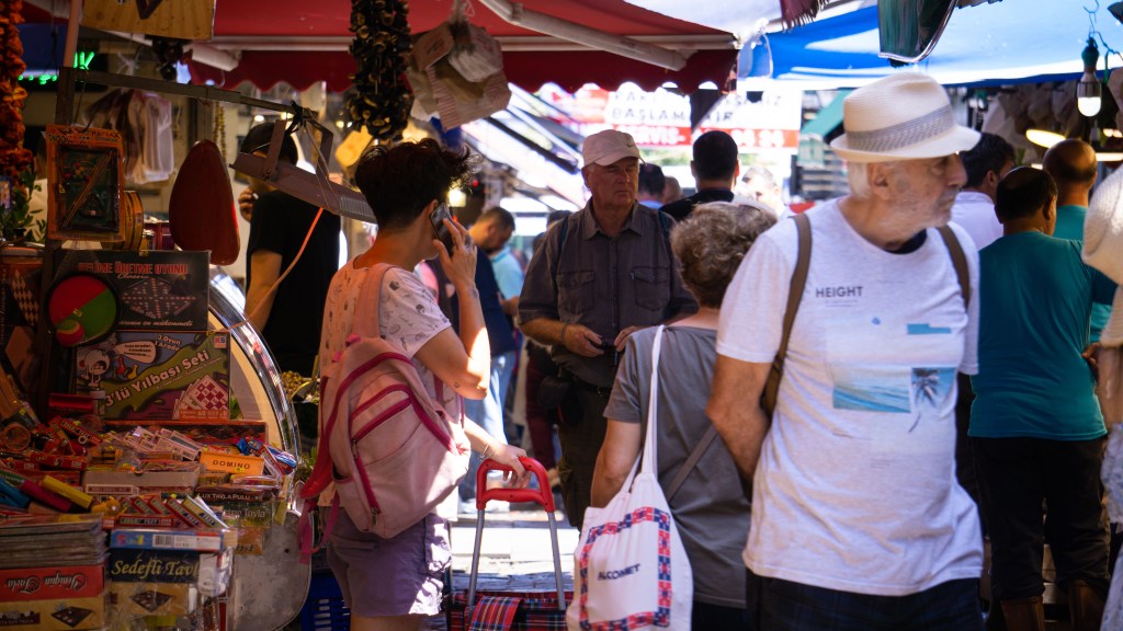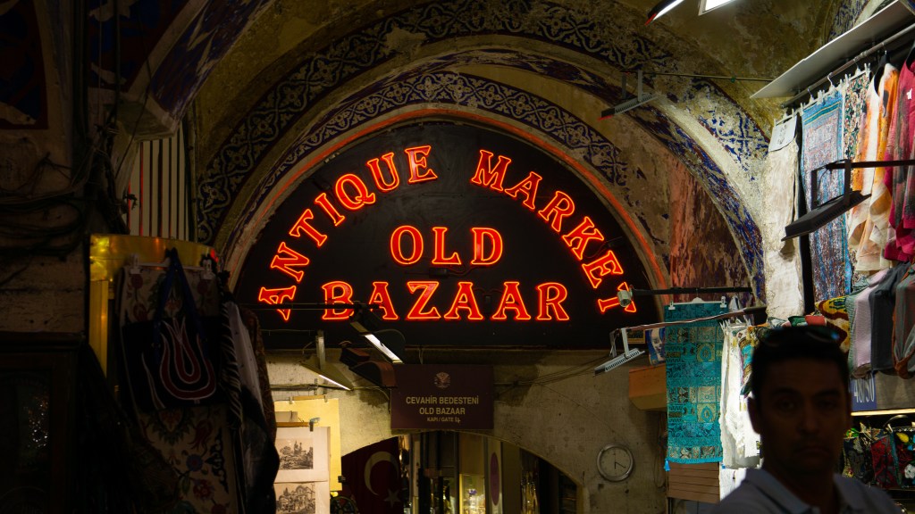 In the main drag, Turkish flags hung from the ceiling and fluttered in the dusty light that filtered through the small windows above. People milled around from shop to shop, and every few meters, the crowd flowed into narrow passageways like water into a crack. It was hard not to get swept into it, and thrown back in time the deeper the passage wound.